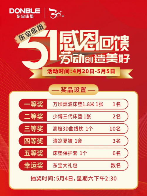 2024年是東寶床墊創立31周年,為感恩回饋廣大消費者一直以來的支持與厚愛,東寶床墊將于5月4日下午舉行免費抽獎活動,免費送出1.8米彈簧床墊、學生折疊床墊、高檔3D枕頭、清涼夏被等豐厚禮品。