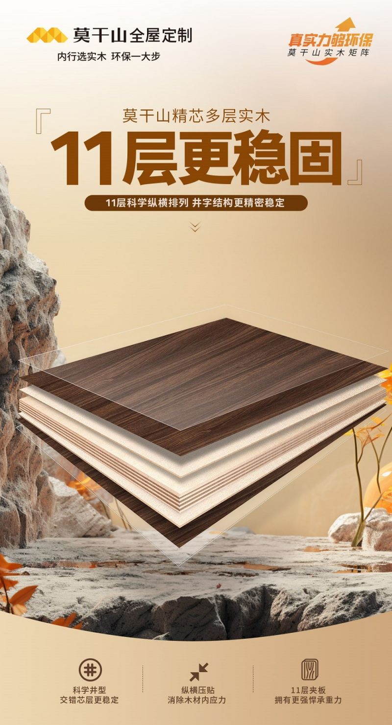 莫干山精芯實木多層板,使用11層夾板,相比常見的7層或9層的多層板,性能更穩固,承重更強悍。內部結構升級,按照科學組胚平面分布,整板整芯縱橫壓貼,消除木材自身內應力,科學井型、交錯芯材優化板材性能,更加結實耐用,使用壽命更長。