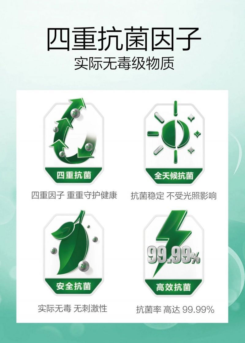 采用無毒無刺激性的“鋅”效抗菌技術(shù),經(jīng)第三方權(quán)威機(jī)構(gòu)檢測板材對大腸桿菌、金黃色普通球菌、銅綠假單胞菌、肺炎克雷伯氏菌抗菌率高達(dá)99.99%,四重抗菌效果,起效條件不受光照影響,24小時全天不間斷抗菌。