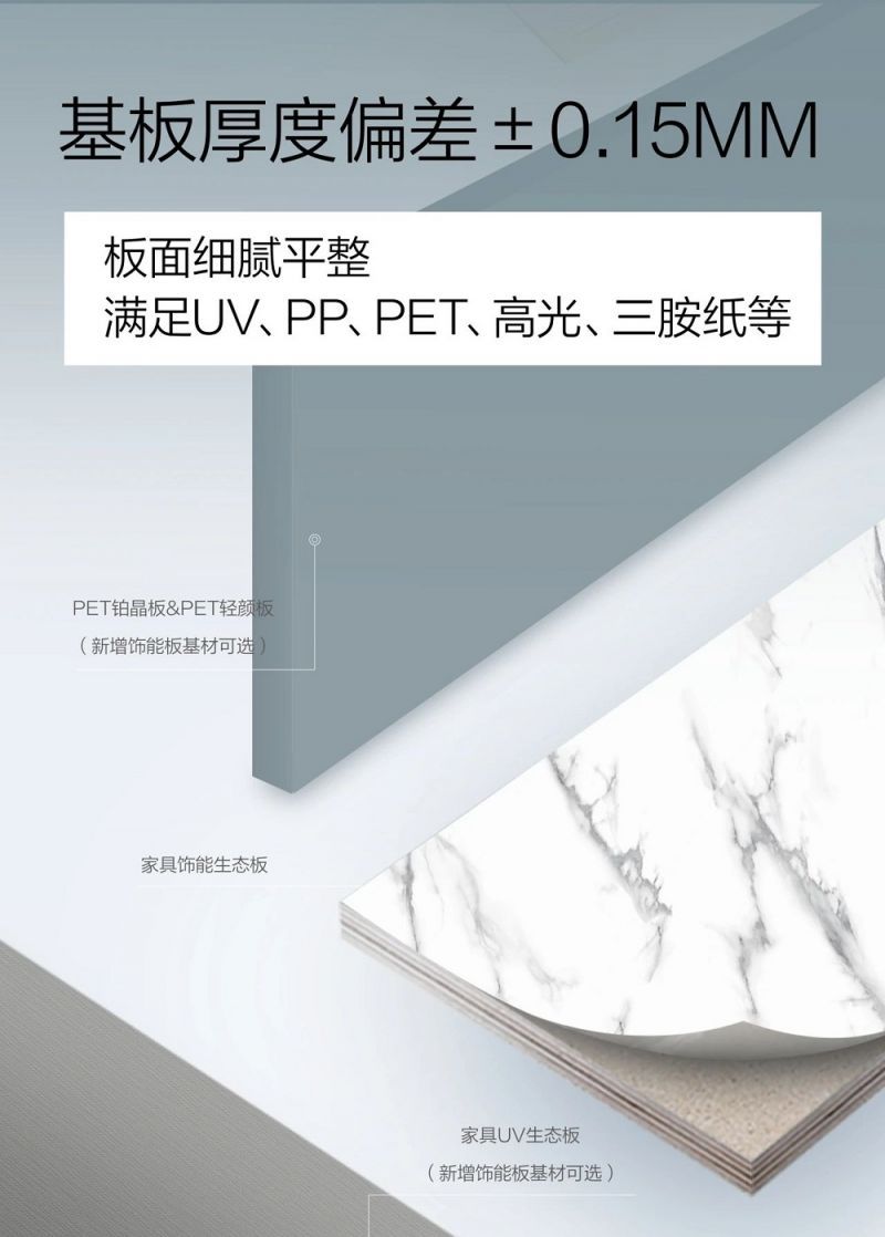 千年舟飾能板飾面系列基板厚度偏差±0.15mm,表面細(xì)膩超平整,可滿足UV光固化、PP、PET、高光、三胺紙純色等不同飾面加工工藝,飾面精美,時尚繽紛,滿足各種個性需求,可廣泛適用在全屋定制家具及超高門板制作。
