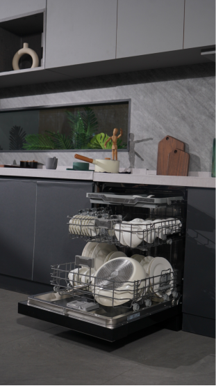 凱度T100洗碗機還采用了雙變頻技術。這一技術使得洗碗機的水壓高達52000PA,從而提高了洗滌效果。同時,超一級水效(干燥指數:1.25;清潔指數:1.25)的表現也證明了凱度T100洗碗機在節能環保方面的卓越性能。這樣的設計不僅滿足了媽媽們對餐具清潔的高要求也符合現代家庭對綠色生活的追求。