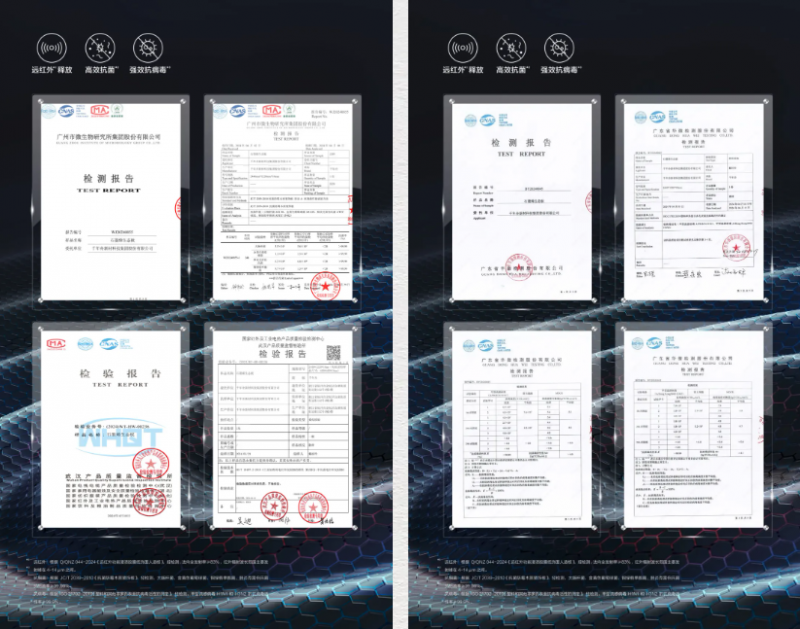 遠(yuǎn)紅外:根據(jù)Q/QNZ 044-2024《遠(yuǎn)紅外功能浸漬膠膜紙飾面人造板》,經(jīng)檢測(cè), 法向全發(fā)射率≥83%,紅外輻射波長(zhǎng)范圍主要發(fā)射峰在4-14μm之間。