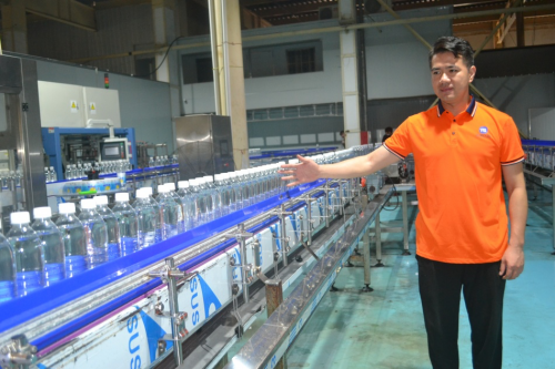 走進(jìn)江蘇雨果飲品有限公司生產(chǎn)車間,只見水處理車間、吹瓶車間、灌裝車間、貼標(biāo)車間、包裝車間、碼垛車間等均是全自動(dòng)化生產(chǎn)流水線設(shè)備,20名工人正有條不紊地操作機(jī)器,整個(gè)生產(chǎn)車間呈現(xiàn)一派有序而忙碌的氛圍。