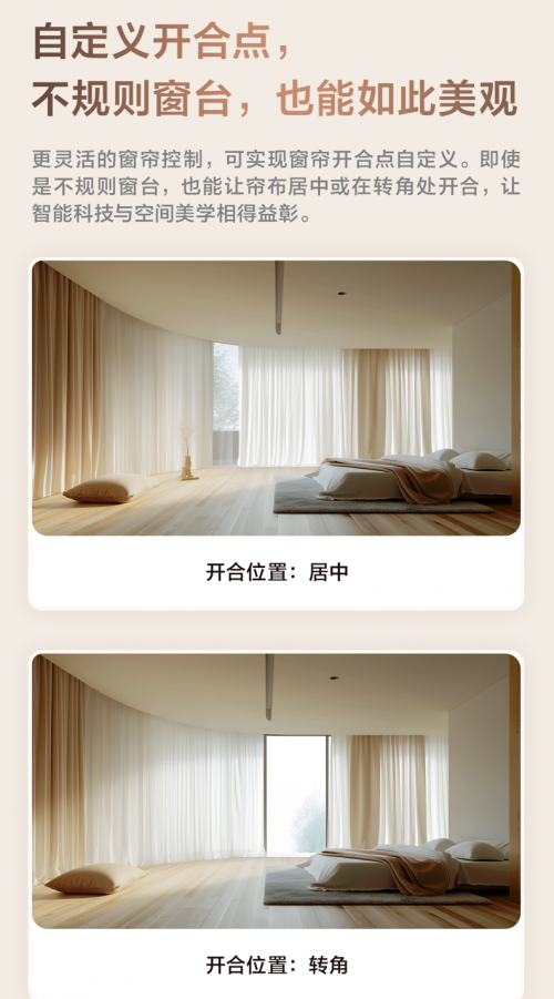 雙電機(jī)及左右獨(dú)立控制的特性,讓 Aqara 風(fēng)琴智能窗簾電機(jī) C4 在應(yīng)對不規(guī)則窗臺(tái)時(shí)也能游刃有余,如帶拐角的窗臺(tái)實(shí)現(xiàn)在拐角處開合等傳統(tǒng)窗簾電機(jī)無法實(shí)現(xiàn)的功能。