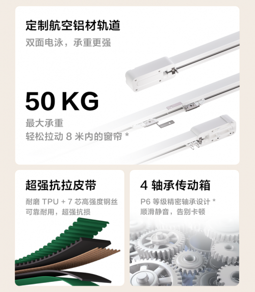 不僅如此,該軌道還具備堅(jiān)固耐用的品質(zhì),最大可承重 50kg,輕松拉動(dòng) 8 米內(nèi)的窗簾,內(nèi)部鋼絲與凱夫拉材質(zhì)結(jié)合的皮帶加上 4 軸承傳動(dòng)箱的設(shè)計(jì),既抗損耐用又順滑隔音。