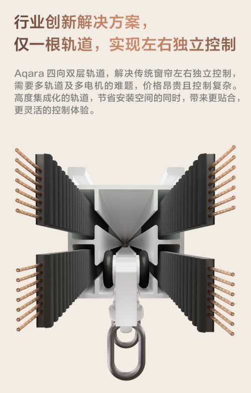 與 Aqara 風(fēng)琴 智能窗簾電機(jī) C4 搭配的為 Aqara 全新定制的四向雙層軌道,僅用一根軌道即實(shí)現(xiàn)窗簾左右獨(dú)立控制,完美解決以往需要兩個(gè)軌道帶來的價(jià)格高、控制復(fù)雜、貼合度差、占用空間大的問題,不僅帶來更貼合、更靈活的控制體驗(yàn),也能適應(yīng)更多的個(gè)性化場景。
