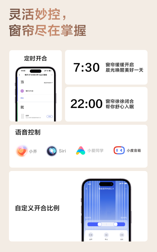 多項(xiàng)創(chuàng)新加持,讓智能窗簾體驗(yàn)更人性化、個(gè)性化、同時(shí)也帶來更多玩法,不僅可以為左右窗簾單獨(dú)設(shè)置更多的自動(dòng)化場景,還可以自定義多種情景模式,如早晨 30 分鐘以極緩速度慢慢打開窗簾的起床喚醒場景,更可與燈光、溫控、音響設(shè)備形成聯(lián)動(dòng),帶來全方位的全屋智能體驗(yàn)。