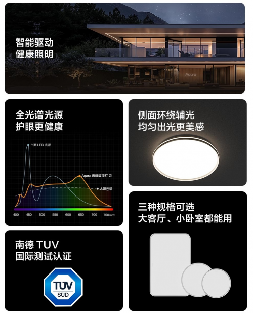 云熙吸頂燈D1S和云耀吸頂燈Z1S通過了嚴格的南德TUV檢測,獲得了RG0藍光豁免級和無可視頻閃雙認證,進一步保障用戶的眼部健康和使用安全。這兩款產品提供三種不同大小規格,分別適用于客廳、主臥室和次臥等多個使用場景,滿足不同空間的照明需求。而且這兩款新品具備萬分級調光深度,用戶可以精細調節亮度明暗和色溫冷暖。推薦搭配繁星妙控旋鈕V1,獲得最佳調控體驗。