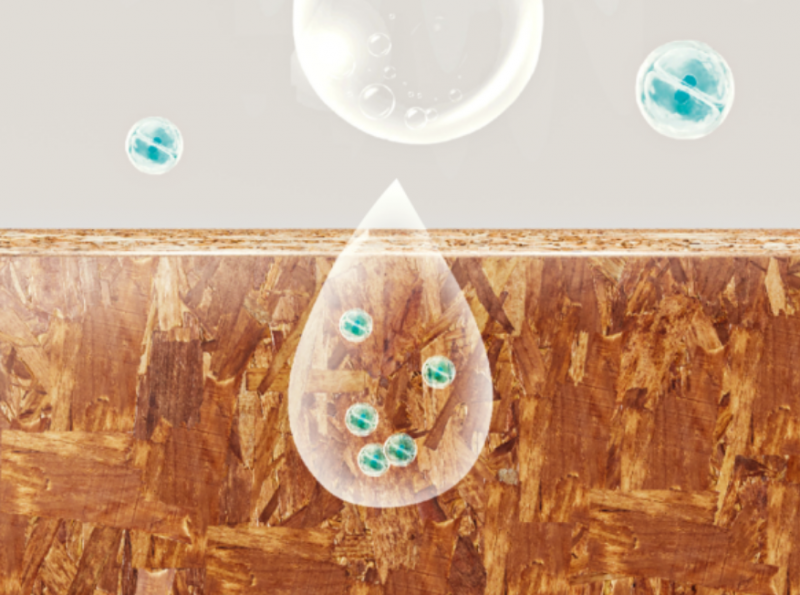 微膠囊包覆技術(shù)有效加強(qiáng)阻燃劑與刨片的界面相容性,從而提高了阻燃劑在刨片表面的接枝率,在潮濕環(huán)境下阻燃劑不會析出,增強(qiáng)阻燃劑的抗流失性。