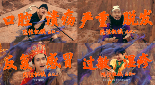 直至他們突然發現“隱性饑餓”早已潛伏身上:豬八戒口腔潰瘍,捂嘴喊疼;沙僧嚴重脫發,面露無奈;唐僧頻繁打噴嚏,反復感冒;就連神通廣大的孫悟空也長滿了濕疹。原來第82難“隱性饑餓”不是蹤影莫測的妖怪,正是一直潛伏在身邊的營養健康隱患。