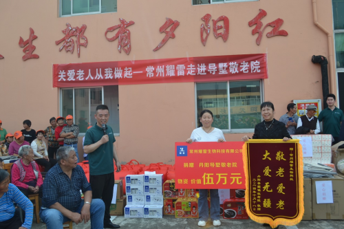 愛心捐贈環節,隨著動聽的輕音樂緩緩響起,“真是太感謝你們了,專程從常州來到導墅鎮,為我們敬老院奉獻愛心,這種愛心之舉,不僅感動了我,更感動了我們敬老院的老人們……”捐贈環節,丹陽市導墅鎮敬老院院長蒯利玉一邊激動地說,一邊向常州耀雷生物科技有限公司贈送了一面寫有“敬老愛老 大愛無疆”的錦旗。此刻,臺下響起經久不息的熱烈掌聲。