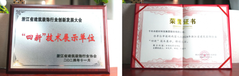 千年舟憑借在技術(shù)創(chuàng)新、智能制造、產(chǎn)品研發(fā)的創(chuàng)新發(fā)展成果和對行業(yè)綠色低碳發(fā)展全方位賦能的杰出貢獻(xiàn),獲頒浙江省建筑裝飾行業(yè)協(xié)會“四新技術(shù)展示單位”。