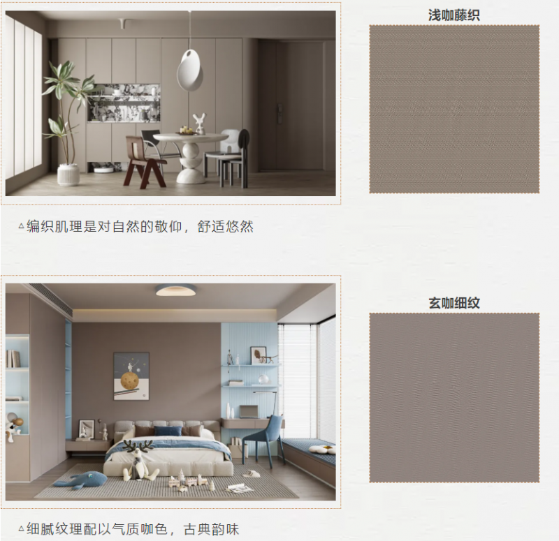 肌理紋的質感更具自然簡約、古典優雅的氣韻。千年舟PET輕顏板高端花色——肌理系列共5款:亞麻淺咖、淺棕格紋、淺咖藤織、玄咖細紋、奶咖細紋。亞麻、編織、格紋、細紋,溫柔靈動、細膩自然,是追求自然與環保、典雅與藝術的空間美感。