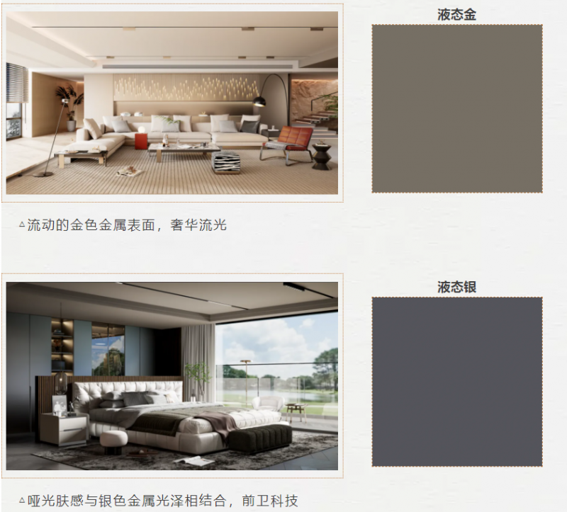 金屬賦予的材質和光澤,高級感油然而生。在光影下明暗自然,大大提升空間的光澤活力與層次質感。千年舟PET輕顏板高端花色——金屬系列共5款:液態金、液態銀、液態灰、香檳拉絲、淺銅拉絲,可搭配多種花色,可廣泛應用在衛生間、廚房、客廳等領域。