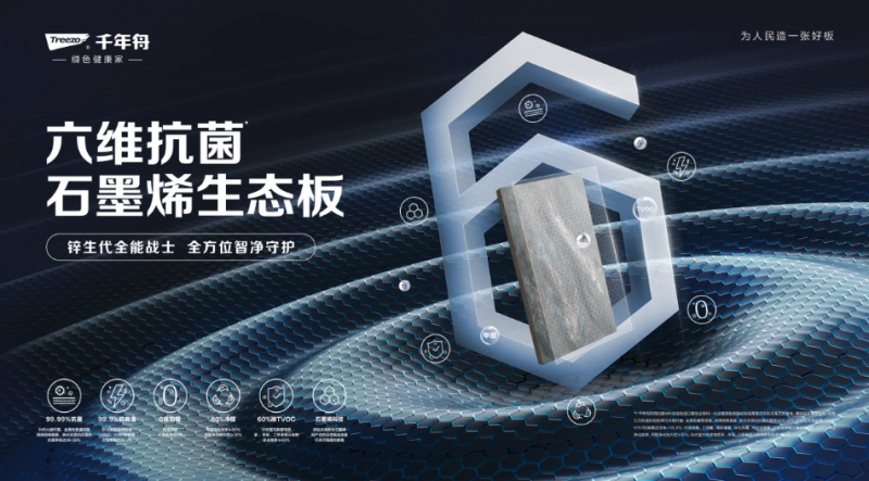 為滿足消費(fèi)者日益提高的對健康板材的需求,千年舟鋅效抗菌石墨烯生態(tài)板全新升級“六維抗菌石墨烯生態(tài)板”,功能性在“雙抗一防”基礎(chǔ)上新增“除醛和除TVOC”,實現(xiàn)石墨烯、抗菌、抗病毒、防霉、除醛、除TVOC的六大功能,化身六邊形戰(zhàn)士以更為強(qiáng)大性能成為守護(hù)家庭健康的全新選擇。