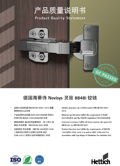 千年舟與世界頂級五金品牌海蒂詩,聯名推出千年舟丨Hettich Novisys靈致鉸鏈, 集品質、性能、優雅、實用于一體。靈致鉸鏈采用鋼鍍鎳防銹材質,經過48小時中性鹽霧測試,滿足9級防銹要求;擁有35°超大自閉角度,輕柔平穩順暢,50000次的開合壽命,內置阻尼結構更美觀,提高使用的安全性和靜音效果;四孔底座更穩固,配合集成深度調節,實現精確的門板間隙,防止門歪、縫大等不合格現象,可用于厚度為14 - 22mm的門板。