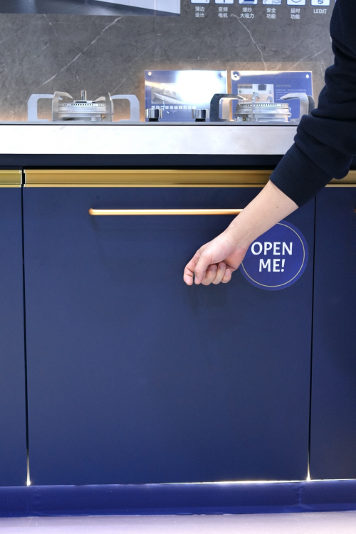 魔法門板系統(tǒng):輕敲即可開門,支持巖板、木紋等多種定制面板,與櫥柜實現(xiàn)“零界融合”。