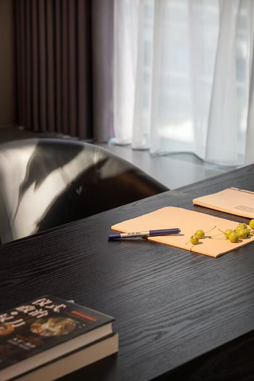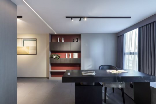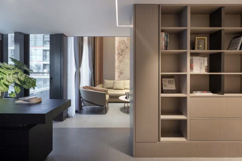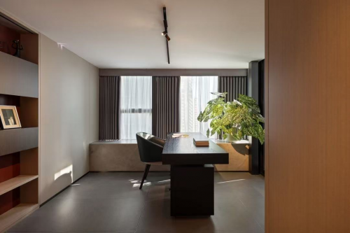 境隨心變。在多功能辦公區,烏色實木工作臺和現代造型皮椅相得益彰,墻面則改造為書架形式,陳列著凸顯整體空間質感的藝術裝置。
