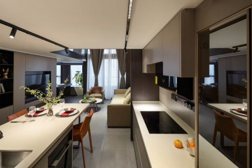 橙棕色餐椅環抱廚房空間的棱角,大片鏡面墻設計,拉長進深有限空間,也將生活的溫度清晰倒映。