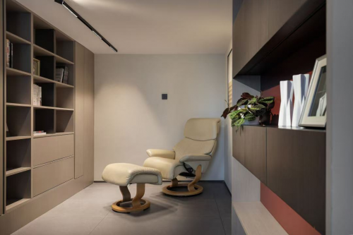 而在需要休憩或獨處空間時,右轉即可進入另一方小天地,書房整體采用米色基調,綴以松軟柔和的奶油色躺椅,用原木、植物構建出清爽有序的冥想世界。
