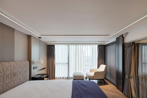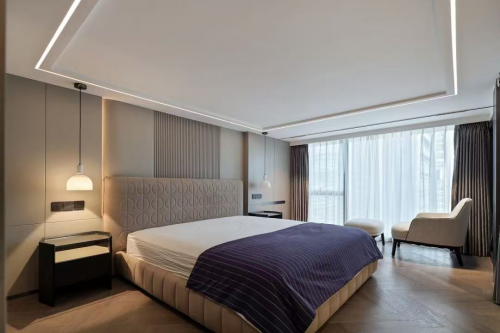 臥室以靜謐的水泥灰色為基調,腳感舒適的原木地板及游走于空間的柔和燈光,不疾不徐地奏響無聲夜曲,引領居者悠然舒適度過“無用”時光。