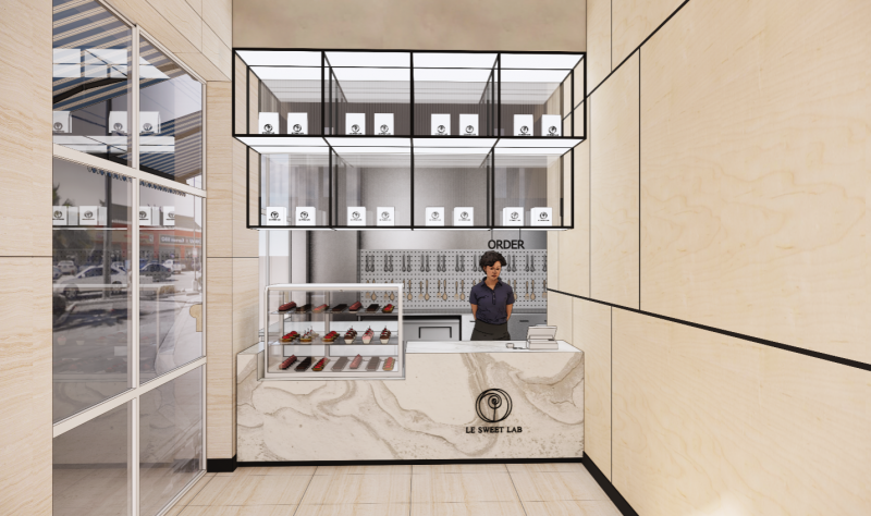 Le Sweet Lab是一個充滿藝術與科學碰撞的甜品品牌,現于美國內華達州拉斯維加斯的以小成本租金和其他品牌共用一個空間開始他們的甜品旅程。我為Le Sweet Lab打造獨特的店鋪氛圍,從2D平面布局到3D空間模型,全方位呈現品牌的奇幻魅力。受旋轉云朵的空靈之美啟發,接待臺采用白色大理石底座,搭配優雅的灰色天然紋理。這一設計不僅呼應了糖與奶油在混合時流動的流體動力學,更以凝固的瞬間捕捉了重力與元素相互作用的詩意。每一道紋路都仿佛在訴說甜品的科學優雅,而整體造型則象征著Le Sweet Lab品牌的核心精神——在甜蜜中探索運動的迷人韻律。通過這一設計,我希望喚起品牌DNA中蘊含的旋轉能量,向Le Sweet Lab標志性的動態美學致敬,讓每一位踏入空間的顧客都能感受到科學與甜點交織的奇妙體驗。