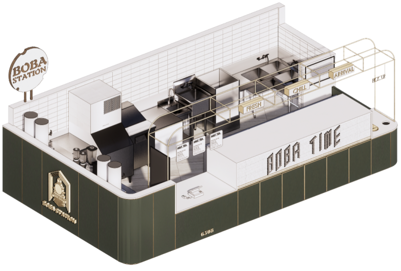 Boba Station 是在加利福尼亞州里弗賽德一個商場里面的一個現代化、功能齊全且視覺上引人注目的珍珠奶茶售賣點空間,旨在提升珍珠奶茶體驗,同時優化工作流程效率。其設計巧妙融合了簡約工業風與實用主義,深綠色面板靈感來自茶葉的綠色、搭配金色裝飾與白色瓷磚,營造出精致而溫馨的氛圍。醒目的“BOBA TIME”馬賽克標牌成為視覺焦點,傳遞出“隨時隨地享受美味”的品牌理念??臻g布局以效率為核心, 可確保關鍵運營區域之間的平穩過渡:到達區(客戶互動和下單)、新鮮區(飲料準備)和冷藏區(冷卻和完成飲料)。開放式柜臺設計提高了透明度,讓顧客可以直觀感受和見證每杯飲品背后的制作工藝杯飲料背后的工藝,同時確保了高效服務。精選的材質進一步強化品牌調性, 潔白的瓷磚、啞光金色金屬框架與柔和的內嵌燈光,共同打造明亮而舒適的空間。策略性放置的菜單板和標牌通過有效地引導客戶完成訂購流程來提升用戶體驗. 這個Boba Station不僅僅是一個珍珠奶茶售賣點,更是一個精心策劃的微環境,融合效率、美學與互動體驗的精致空間,確保每一杯奶茶都給人留下深刻的印象。