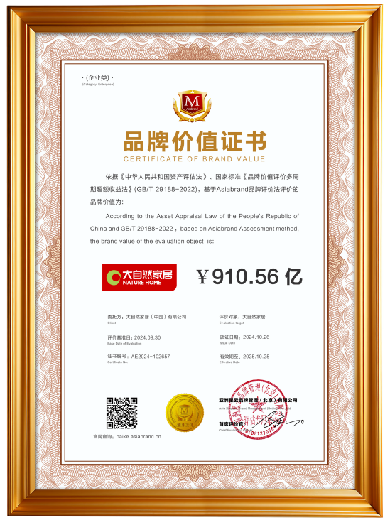 品牌,是企業(yè)的靈魂。從1995年創(chuàng)立伊始,大自然家居便以實(shí)木地板起家,積極探索市場(chǎng)新需求,深耕實(shí)木地板領(lǐng)域。早在2000年,大自然地板就成為實(shí)木地板國(guó)家標(biāo)準(zhǔn)、行業(yè)標(biāo)準(zhǔn)的起草單位之一,為行業(yè)的規(guī)范化發(fā)展做出了突出貢獻(xiàn)。2024年大自然家居更是憑借 910.56 億的超高品牌價(jià)值,2018年--2024年連續(xù) 7 年榮登 “亞洲品牌 500 強(qiáng)”。這一傲人成績(jī)的背后,是大自然多年來始終肩負(fù)著滿足全球消費(fèi)者理想居住環(huán)境的使命,以品牌為基石,不斷在產(chǎn)品研發(fā)、設(shè)計(jì)、制造等各個(gè)環(huán)節(jié)深耕細(xì)作,持續(xù)創(chuàng)新。正是這種對(duì)品牌的執(zhí)著與堅(jiān)守,推動(dòng)著民族家居產(chǎn)業(yè)邁向高質(zhì)量發(fā)展的道路,也為大自然家居在地板品類銷售中拔得頭籌奠定了堅(jiān)實(shí)基礎(chǔ)。30年風(fēng)雨共濟(jì),欲見高樓起,需向難處尋。榮譽(yù)背后,大自然家居擁有十足的底氣。