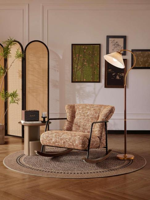 而沙發一旁的搖搖椅,金屬框架和實木底座結合,三防提花面料流淌自然曲線形態,猶如陽光灑在成熟的柑橘果實上,生活此刻搖曳生姿。