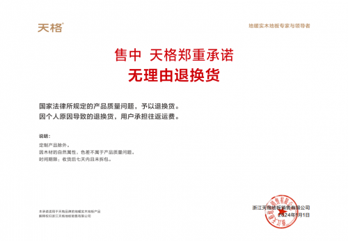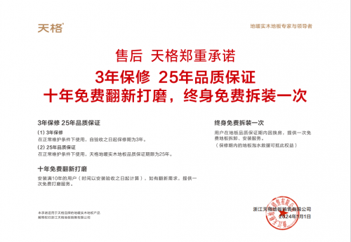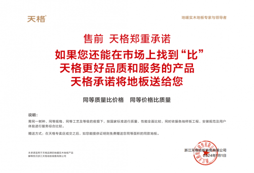 為進一步保障用戶地板使用權益,天格地板還推出了五大承諾保障。其中包含售前質量與價格的對比,售中無理由退換貨,售后的3年保修、25年品質保證、十年免費翻新打磨、終身免費拆裝一次。值得一提的是,3年保修這一條,不僅彰顯了天格對產品質量的自信,更以其超越行業(yè)標準的保修期,樹立了地板行業(yè)售后服務的最高典范。