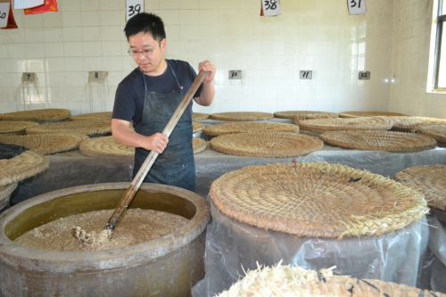 “以當地所產優質糯米為原料,經浸米、洗米、蒸熟、淋凈,搭窩、加入草藥(自制麥曲)為糖化發酵劑,在糖分達到一定要求時,再摻入50度小曲酒中途停止發酵,隨后立即分缸密封,經較長時間養醅后,再壓榨、陳釀,最終制成。” 談起封缸酒的釀造過程,楊如峰介紹,這里還保存著祖輩們傳統封缸酒釀造技藝,全靠工人手工操作。“一壇鮮甜醇香的丹陽封缸酒,需要經過17道制作工序,不僅過程復雜,對技藝的要求也非常高。”