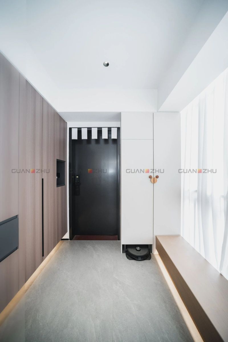 屋主Aison在進門處精心設計了一塊落塵區,他解釋說:“這樣設計是為了營造一種儀式感,在視覺上提醒回家的人該放松下來了。”冠珠產品的多元應用滿足了這次設計巧思的呈現。玄關處融合鋪貼冠珠微光石流沙-墨灰與冠珠微光石流沙-硯灰兩款產品,深色磚隱匿灰塵,淺色磚提亮空間,近看漸變過渡,遠看渾然一體,美觀又實用。