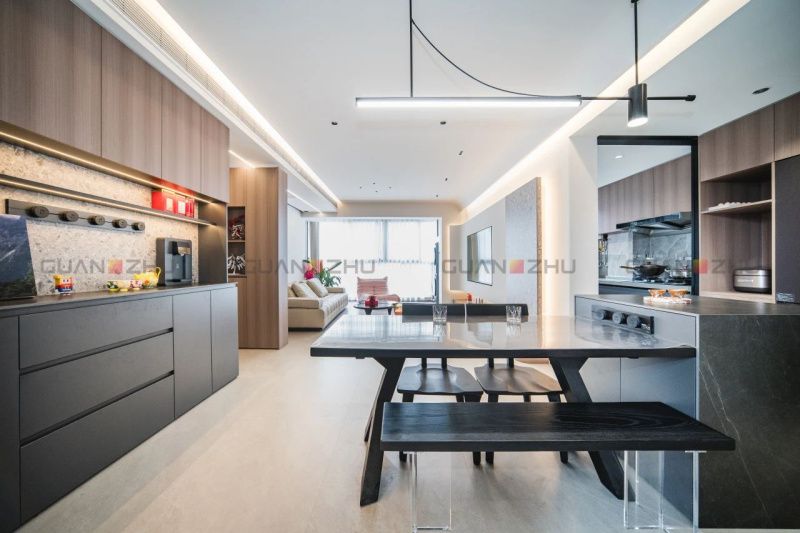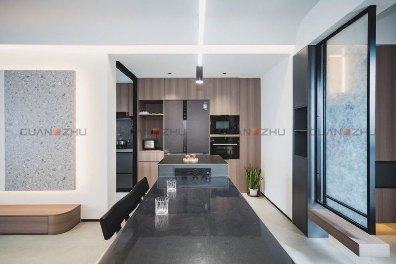 迎合夫妻倆中西交融的飲食習慣,島臺餐桌的開放設計,滿足西式輕食的便捷需求;獨立的中式廚房,則承載著他們對傳統飲食的熱愛。該區域的所有所有電器都做了內嵌設計,并搭建節能技術,進一步降低能耗,讓廚房成為環保與實用兼備的場所。餐廚空間選用綠色環保型材料——冠珠微光石流沙-硯灰,也是他們可持續理念的體現,低維護需求和超長使用壽命,在滿足環保和耐用的基礎上,默默見證他們充滿愛的每一個日常。