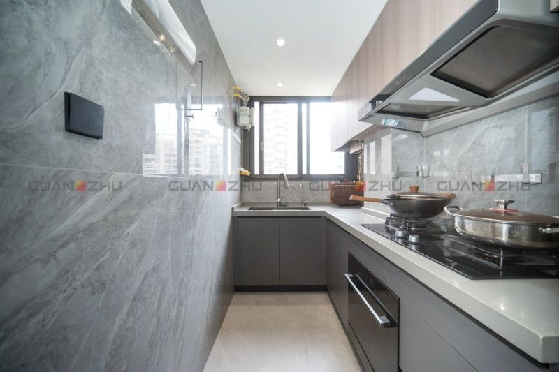 屋主Aison說:“廚房墻面,我們希望能有多一點點的反光。”這樣的設計,小空間也能顯得明亮而有活力。墻面搭配暖灰色的冠珠塞浦路斯灰,折射出柔和的光線,靈動的大理石連紋順著光線延伸,賦予空間極致視覺張力。
