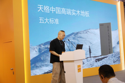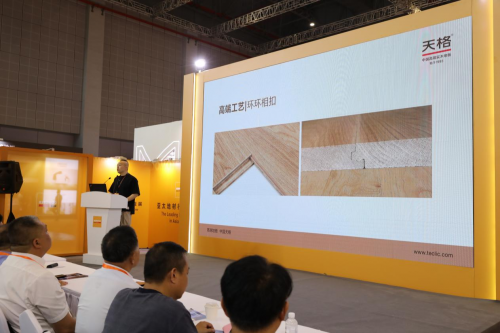 展會上,天格通過沉浸式展位設計與觀眾深度互動,將其對“高端”的理解轉化為可感知的體驗。整個展位以中國“天、木、人”三方平衡為理念,使用大量的天然木材并融入中國傳統榫卯結構。觀眾不僅能觸摸到實木的天然質感,還能直觀了解到通過以榫卯結構為靈感的鎖扣連接技術的精妙。2024年,天格品牌定位全新升級,以“表里如一的高端品質、面面俱到的高端服務、總部負責的高端安裝、環環相扣的高端工藝和五大承諾的高端保障”為核心,系統性重構高端地板的價值鏈。在展會第二日,由實木地板聯盟舉辦的《世界的就是中國的 中國地板多元文化創新發布》活動上,天格營銷副總經理張山山先生再次深度解讀了中國高端實木地板五大標準,讓用戶從選購到使用全流程感受到中國地板品牌打造的真正高端內涵,贏得了業內人士的高度認可。