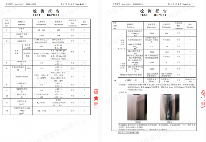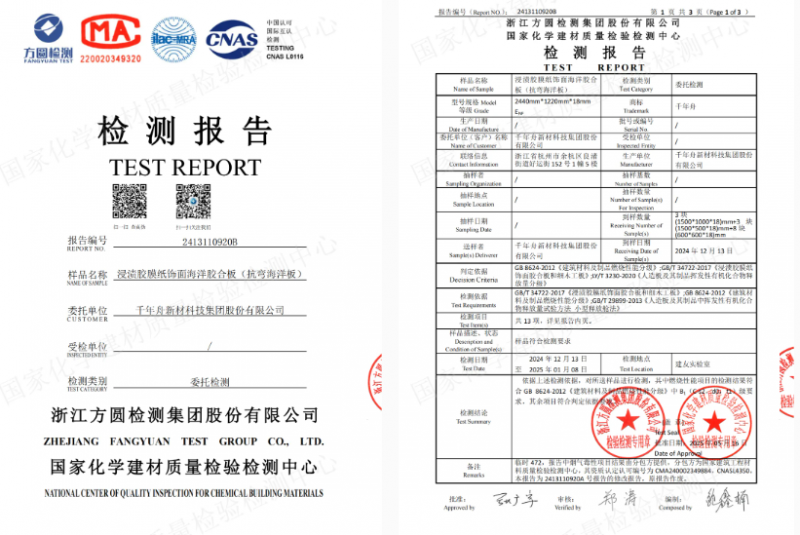 千年舟抗彎海洋生態(tài)板生產(chǎn)過程中使用無機(jī)膠黏劑,本身不燃且耐受高溫,成品板經(jīng)第三方檢測(cè)后,燃燒性能達(dá)B1級(jí)難燃,離火不燃燒;而且抗彎海洋生態(tài)板被燒灼后少煙、低毒,600s總煙氣生成結(jié)果22,遠(yuǎn)低于國(guó)標(biāo)≤200的要求,全方位呵護(hù)你和家人的安全!