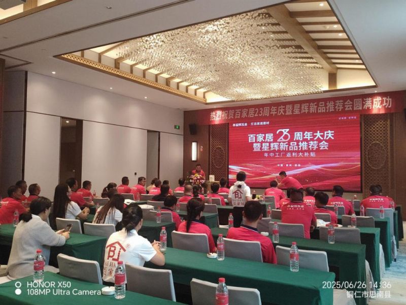 6月26日,為加強與工長群體的合作紐帶,星輝瓦業總部與貴州思南百家居建材于思南縣九天溫泉酒店攜手舉辦了“百家居23周年店慶暨星輝產品推薦會”。本次活動由星輝瓦業總部營銷中心負責人李剛李總帶隊出席,思南百家居建材全體人員以及當地百余位工長聯盟伙伴參加,現場氣氛熱烈非凡,眾多工長伙伴齊聚一堂,共譜合作新篇。