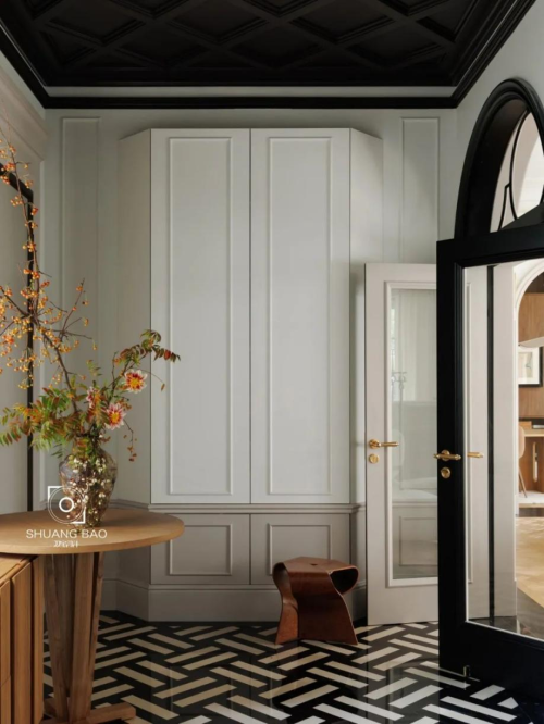 推開入戶大門,玄關處左側的鞋帽柜以梯形隱入墻面之中,圓桌與矮柜貼墻而置,為主人的每次出行與回歸做好收納準備,使得每次出行與回歸都有條不紊。兩扇黑白分明的雙色門強化室內與室外的界限,將玄關與室內分隔,創造出歸家的儀式感。格紋吊頂的天花板與黑白拼花的馬賽克地面在上下呼應中,展開家的故事序幕,順著動線前進,便可直入會客廳和花園。