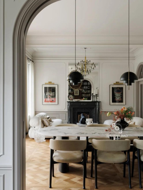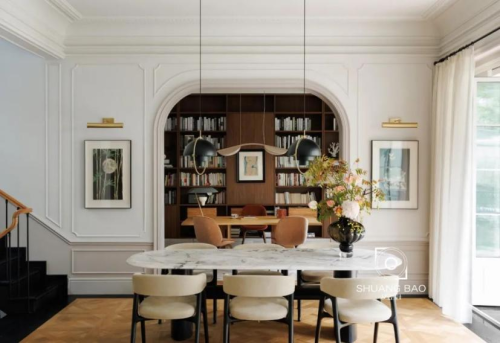 餐桌餐椅都來自Baxter,吊燈來自Gubi,掛畫是藝術家文藝的國畫《游園》和《瀟湘月華圖》。可開合的隱藏式推拉門讓書房可以化身為獨立空間。圓潤的弧形門框讓書房在敞開時柔化空間的視覺界限,帶來優雅和諧的美感。