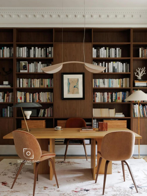 吊燈來自Flos,落地燈和椅子都來自Gubi,書桌是丹麥Menu 的Androgyne系列。滿墻的胡桃木書架呈現出木材特有的天然質樸與溫潤,與身俱來的清雅感讓書房成為感知層面的延展性容器,每一次沉浸式閱讀與冥想,都是回歸內心的旅程。