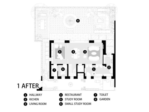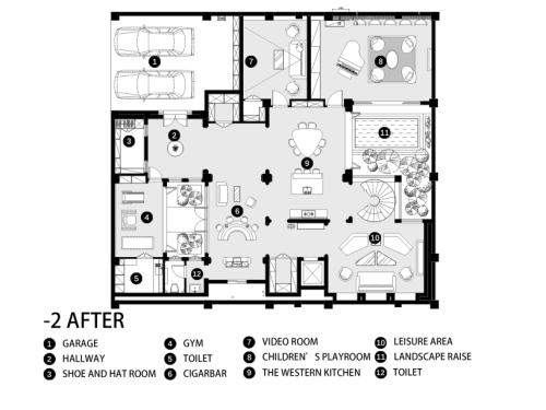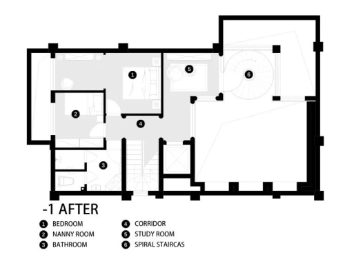 改造后: 我們設計師通過空間的規劃與巧妙布局,在自然與人工之間尋找平衡。在進門玄關處設計隱藏式梯形鞋帽柜,并以兩扇黑白分明的雙色門強化室內與室外的界限,將玄關與室內分隔。在地下室大刀闊斧地拆除部分墻體改為寬闊的落地窗。為房子量身定制排水方案,增設隔潮墻,讓地下空間免受陰暗潮濕的困擾。設計鋼板與實木混合的旋轉樓梯。新增霧霾藍百葉窗,在地下室模擬自然光的裝置藝術。全屋的軟裝陳列不會過度刻意,傳遞出祥和悠閑的生活方式。