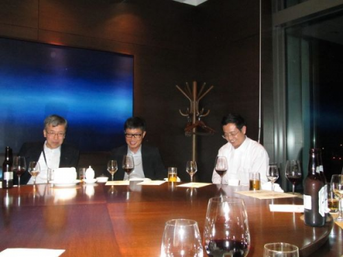 (菜農陪同方洪波,參加東芝開利的商務晚宴。方洪波(中),東芝開利社長(左),菜農(右))