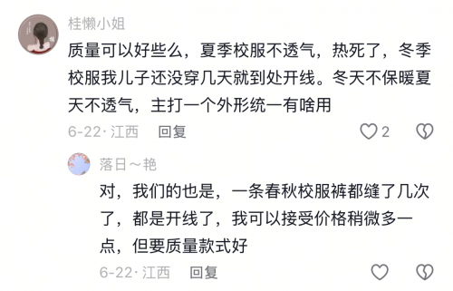 校服是孩子天天穿的“第二層皮膚”,不是搞形式主義的道具。家長掏錢,就該校長自己選擇款式、選擇審美、選擇品質。作為家長我們不會一味追求低價,19.9元的夏季校服我可不敢買!哪個孩子不是全家的重點保護?哪個家長愿意用孩子的健康,去換所謂的“管理便利”。甲醛超標的校服,穿在身上的是衣服,懸在心上的是刀子啊!
