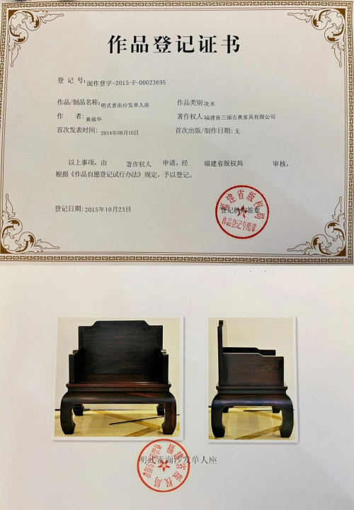 自2014年起,三福團隊便潛心投入該系列家具的研發。從最初的器型設計(2015年成功申請版權登記保護),到2016年對雕刻圖案進行二次研發設計并完成成品,直至2019年對最終的雕花鳥沙發組合成品本身進行版權登記,三福展現了對知識產權全鏈條保護的深刻理解,貫穿于設計、打樣、定稿、生產全過程的主動保護策略。