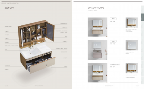 表現在2025B系列浴室柜上,光是拉手包覆,就可以提供5種顏色進行選擇,包括木紋色2種(柚木色、原木紋)、金屬色2種(鎳拉絲、紳士灰)、純色1種(筍白色);臺盆也有瑩白亮光盆、彩色亮光盆、彩色磨砂盆等多種既具時尚氣質,又帶有高級感的色彩。