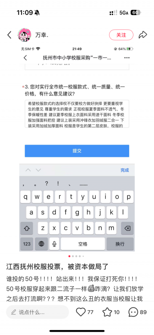“一市一款”的推行邏輯,本質(zhì)上是將教育管理簡化為“標(biāo)準(zhǔn)化生產(chǎn)”。“政府入圍零售”形成壟斷,導(dǎo)致企業(yè)競爭焦點(diǎn)集中于低價(jià)劣質(zhì)而非質(zhì)量與創(chuàng)新,這種機(jī)制直接架空了學(xué)校的選擇權(quán)。正如江西某地家長在社交平臺的吐槽:“擬定的校服根本沒經(jīng)過投票,都是內(nèi)定的。”當(dāng)校服采購淪為“行政主導(dǎo)”,家長與學(xué)生的聲音便容易被邊緣化。