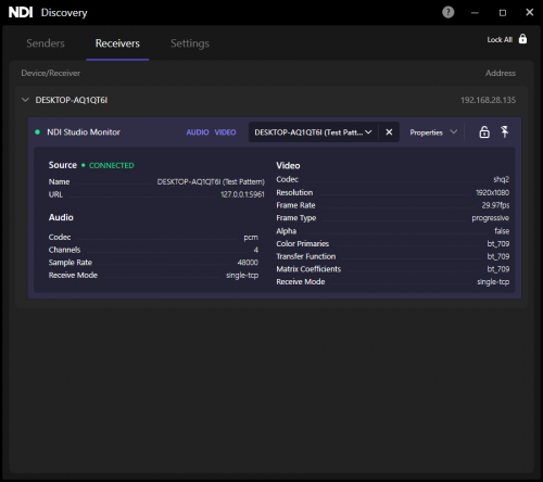 ● (四)啟動NDI Discovery工具,此時您將看到您的Studio Monitor正在接收什么NDI源、它的視頻格式/音頻格式是什么、碼率是什么;您還可以用Discovery工具“遙控”你的Studio Monitor,為它選擇切換不同的NDI源。