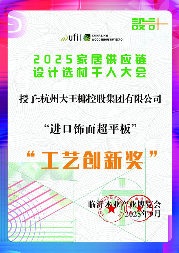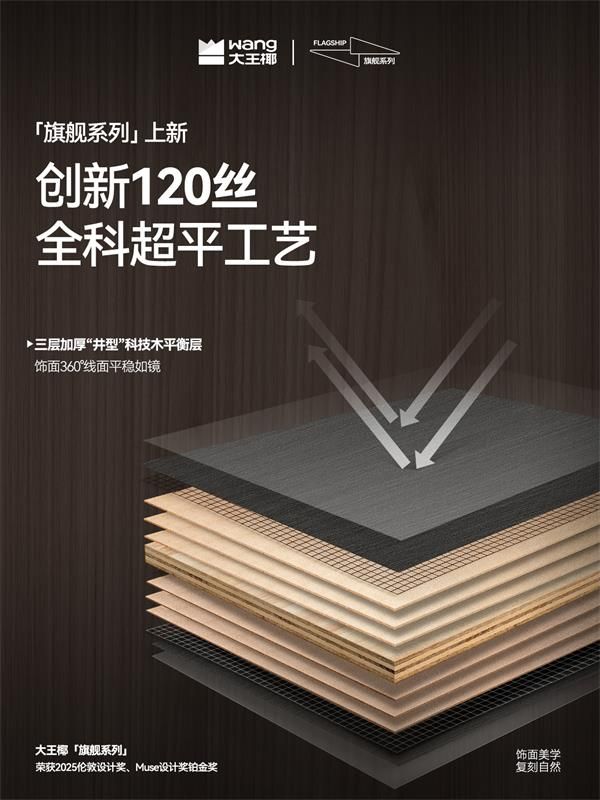 在同期舉辦的2025家居供應(yīng)鏈設(shè)計(jì)選材千人大會(huì)上,這款引發(fā)飾面美學(xué)價(jià)值共鳴的新品,成功斬獲了由組委會(huì)頒發(fā)的“工藝創(chuàng)新獎(jiǎng)”;從美國(guó)Muse設(shè)計(jì)鉑金獎(jiǎng)、倫敦設(shè)計(jì)鉑金獎(jiǎng)等六項(xiàng)國(guó)際大獎(jiǎng)加冕,到再奪業(yè)內(nèi)“工藝創(chuàng)新獎(jiǎng)”,大王椰旗艦系列上市的“開(kāi)掛”之路,本質(zhì)上是一場(chǎng)“美學(xué)&品質(zhì)”升維的破卷突圍戰(zhàn)。