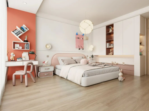 肯帝亞地板在色彩表現上更具活力,部分款式專為年輕家庭設計,為兒童房注入更多生機與趣味。其產品在色調選擇上更趨明亮活潑,如淺灰、米白、暖黃等溫馨配色,能營造輕松愉悅的空間氛圍。