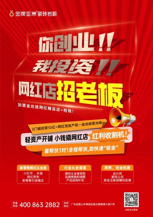 在建材家居行業新零售浪潮下,金牌亞洲憑借“網紅精品店盈利模式” 與“金絲絨爆品戰略”雙引擎,以強勢品牌勢能霸屏廣州南站觸達億萬高凈值人群;與此同時,品牌全國首推的金絲絨網紅精品店招商也熱力開啟,以 “你創業,我投資” 的誠意,為建材行業創業者鋪就低門檻、高回報的路徑。陶博會期間,金牌亞洲“選金牌?贏未來”財富招商會即將啟動,在新零售浪潮中為創業者打開家居行業的財富新大門。